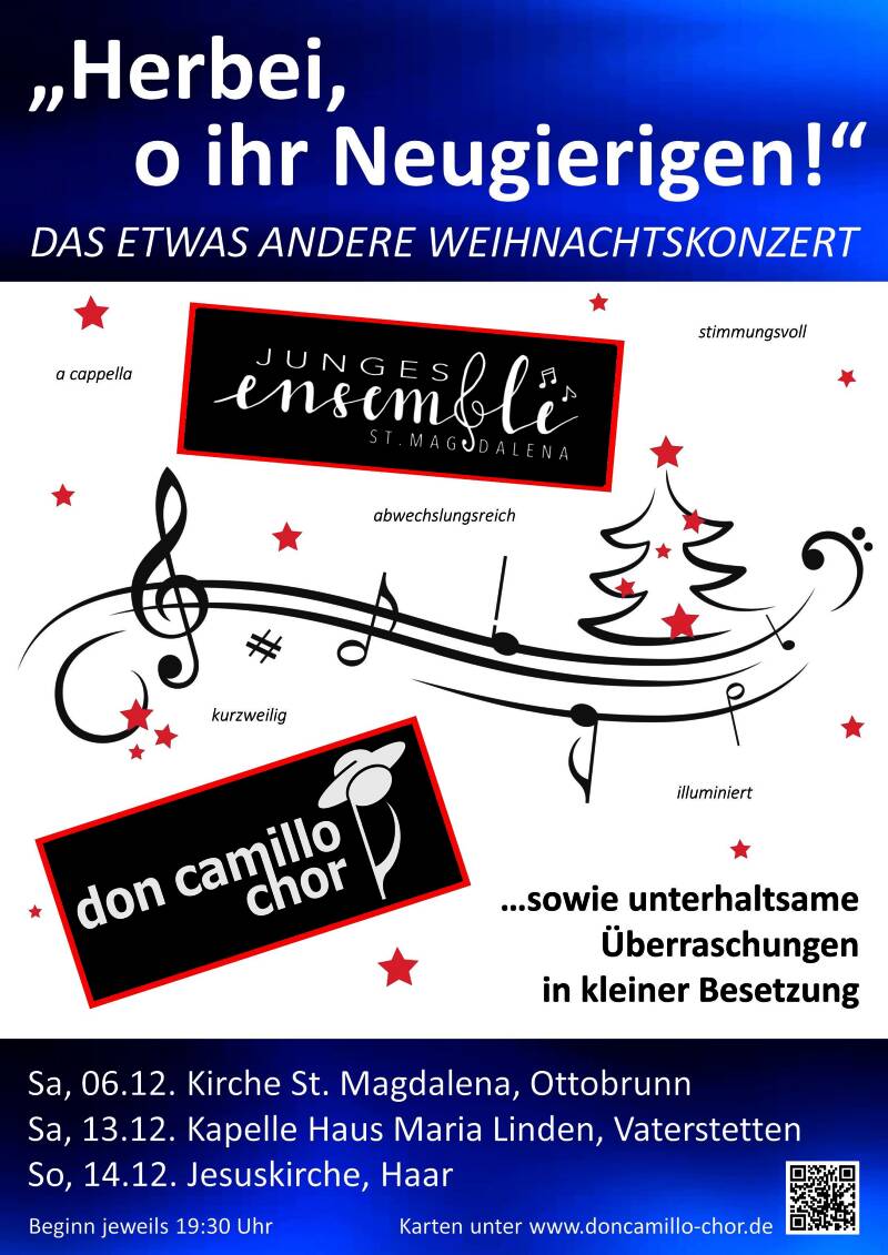 Der "don camillo chor" und das "Junge Ensemble St. Magdalena" laden ein zu einem ganz besonderen Weihnachtskonzert. Auf dem Programm steht ein kurzweiliges, sehr abwechslungsreiches Repertoire in wunderschönen Arrangements mit altbekannten und auch unbekannten Melodien rund um die Weihnachtszeit. Alles a cappella und zudem noch stimmungsvoll illuminiert.